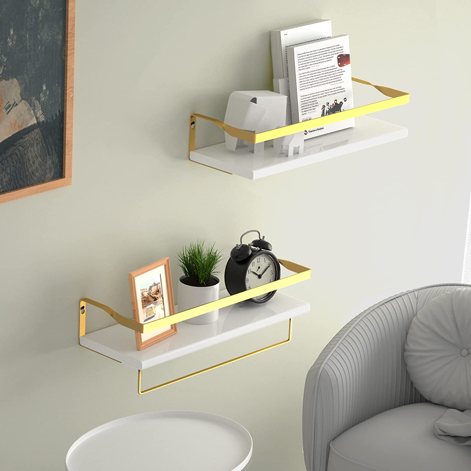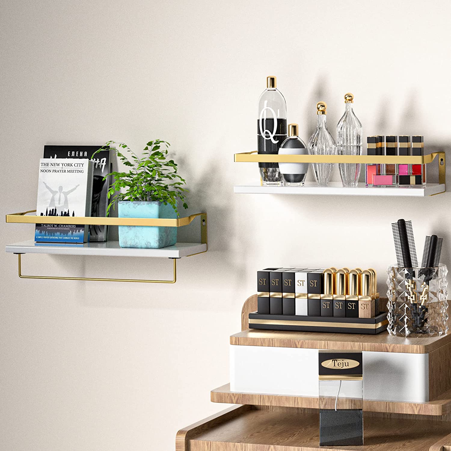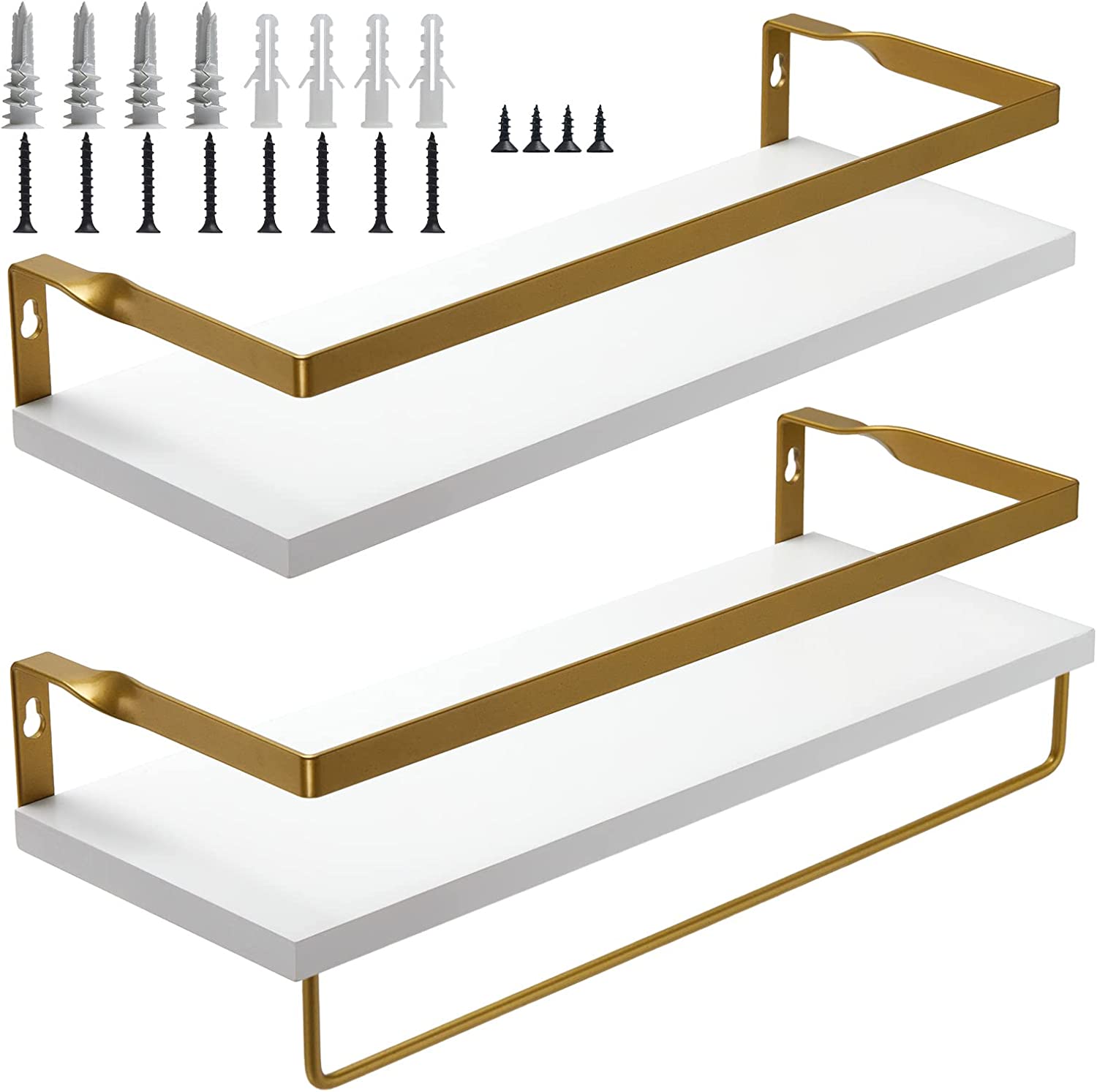 IDEA CASA Floating Shelves Wall Mounted - Wood Wall Shelf Floating Shelves Bathroom Decor - Kitchen Wall Shelf Rustic Floating Shelves for Bedroom - Wooden Bathroom Shelf 2 Pack Floating Bookshelves (Gold)